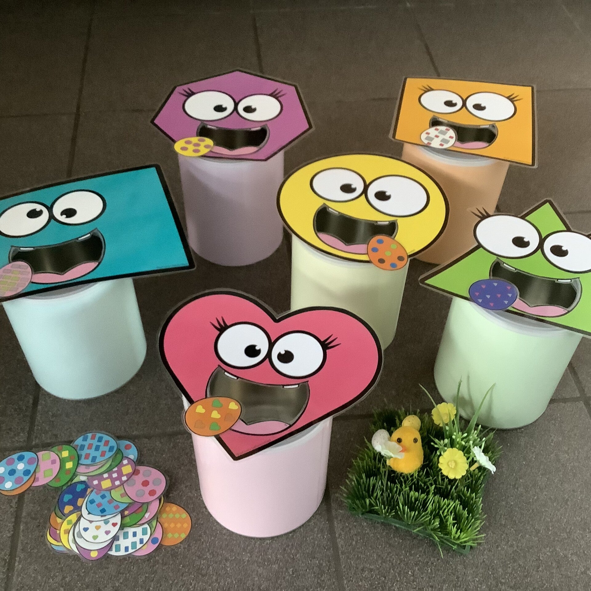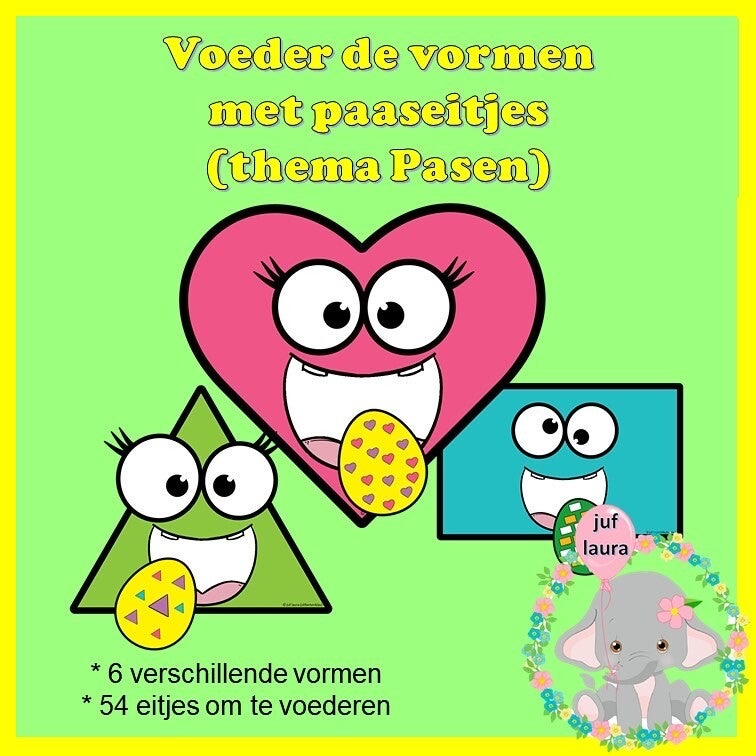 In dit bestand zitten verschillende vlakke figuren die gevoederd kunnen worden. Voeder ze met de paaseitjes die dezelfde vlakke figuurtjes hebben.