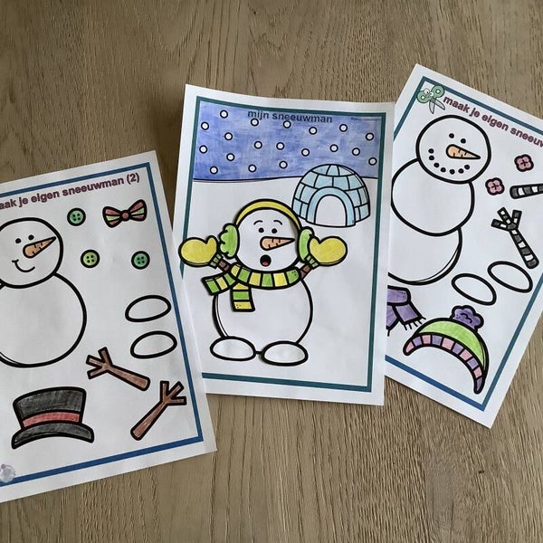 In dit bestand zitten de delen om een sneeuwman te maken (3 varianten). Deze kunnen de kinderen uitknippen en kleven zodat ze opnieuw een geheel hebben van hun gekozen personage. Er is ook een achtergrond waarop de sneeuwman gekleefd kan worden